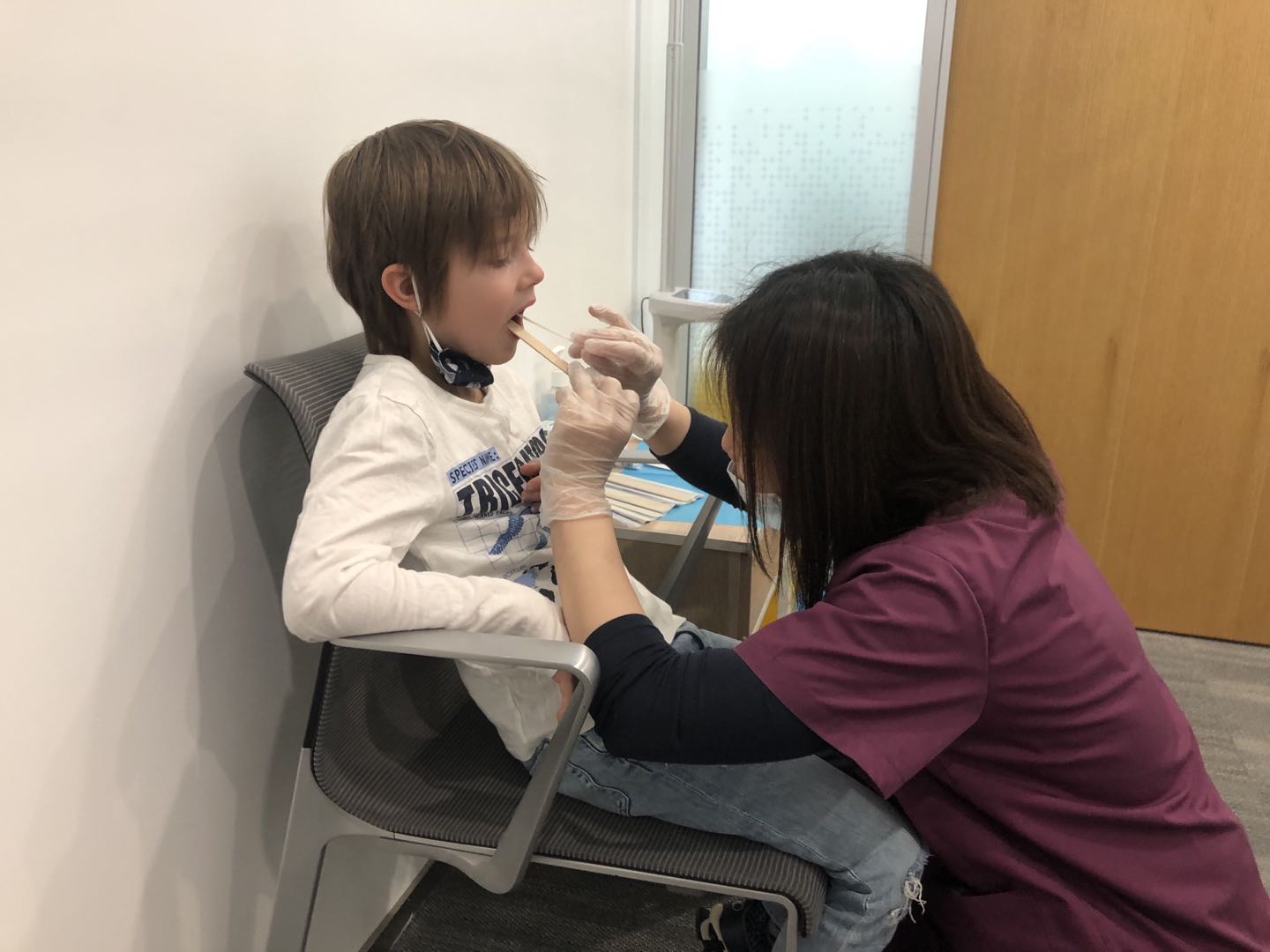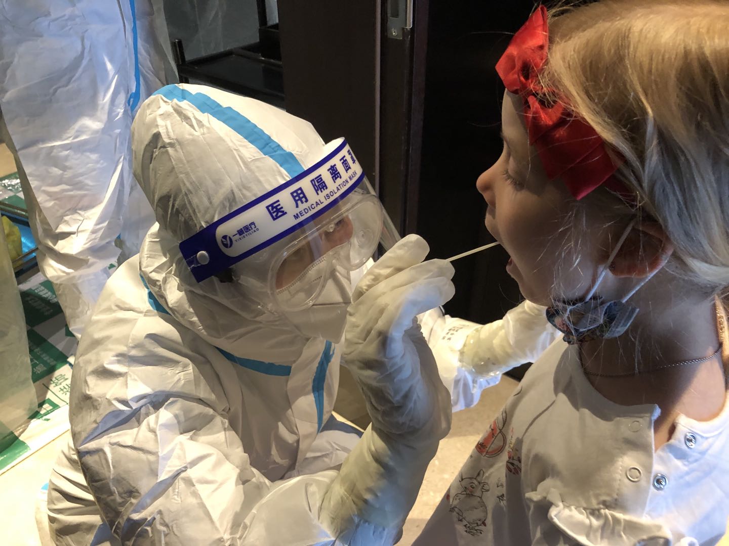 In der zweiten Woche der Quarantäne haben die Plastikmenschen den Corona-Test dieses Mal an der Türe gemacht. Zuerst haben sie geklopft und dann bei uns drei einen Test gemacht. Ein paar Minuten danach mussten wir zum Blut abnehmen wieder raus
